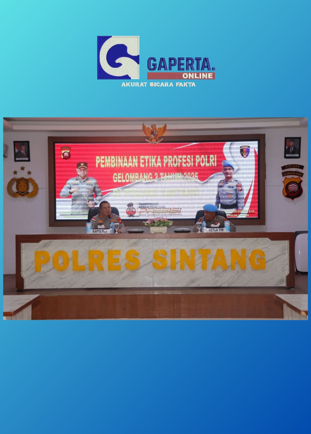 Guna memantapkan integritas dan profesionalisme, Bid Propam Polda Kalbar menggelar Pembinaan Etika Profesi Polri di Polres Sintang. Kapolres Sintang, AKBP Sanny Handityo, membuka acara yang diikuti oleh jajaran penting Polres Sintang pada Rabu (29/10) pagi.