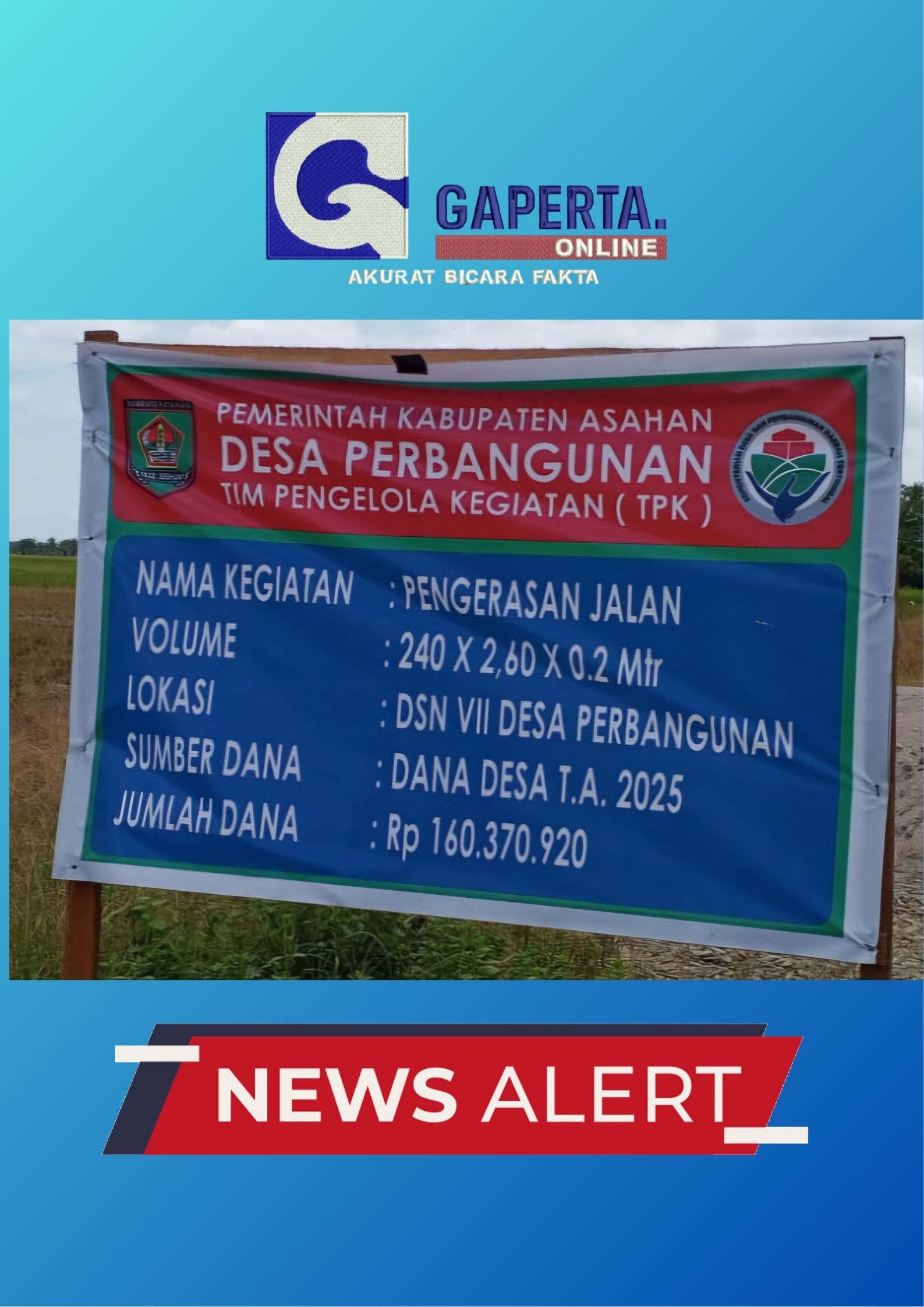 Berdasarkan dokumentasi foto dan fakta di lapangan, muncul dugaan kuat ketidaksesuaian dalam pelaksanaan proyek pengerasan jalan di Desa Perbangunan, Kecamatan Sei Kepayang, Kabupaten Asahan.