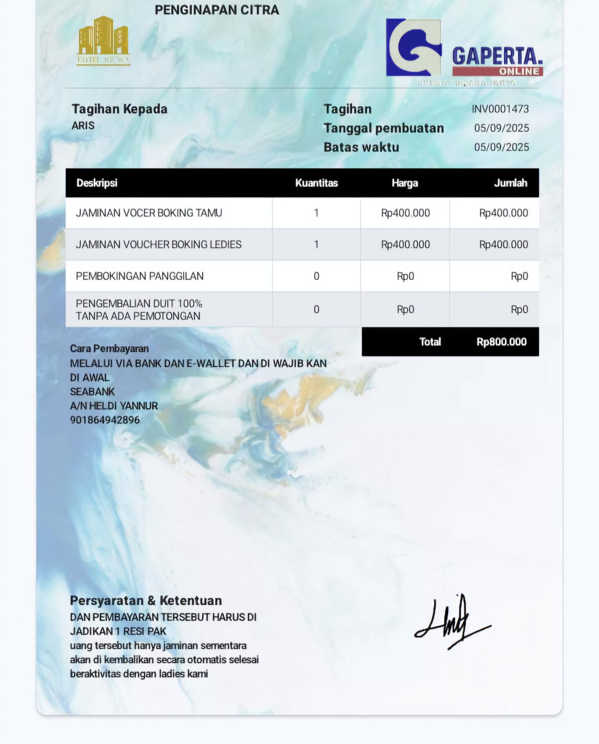 Bukti Pembayaran Yang Di keluarkan Oleh Penginapan-(Gaperta.online-Dok)