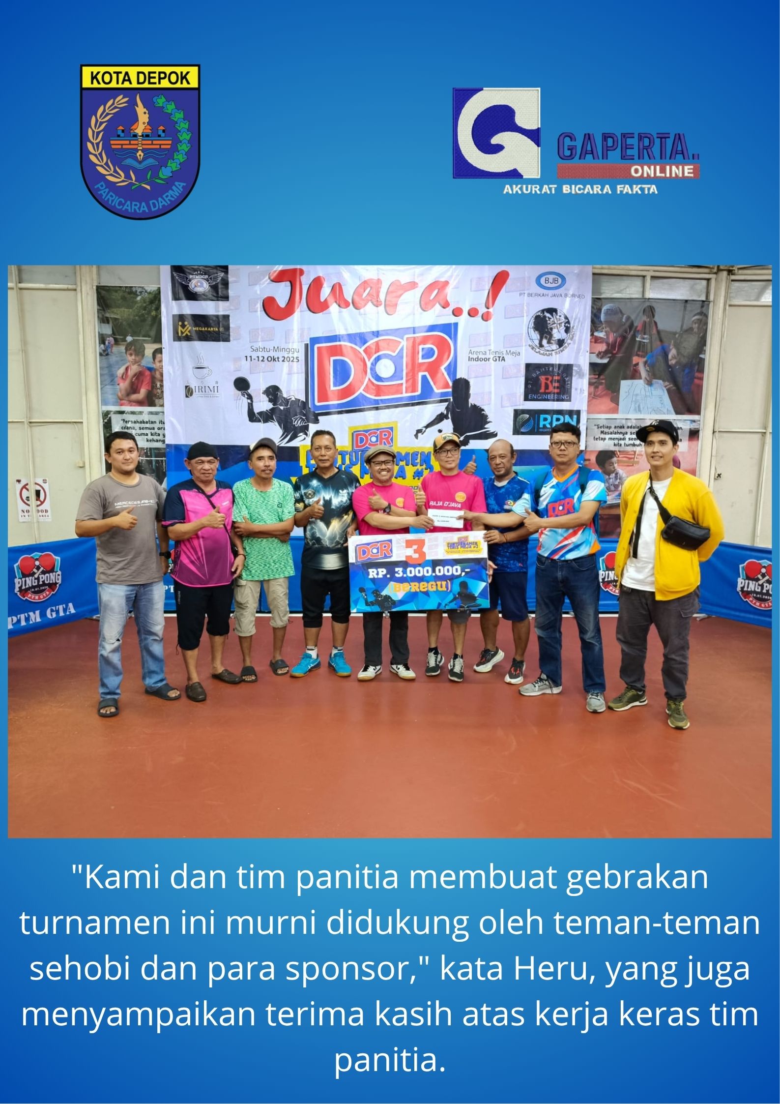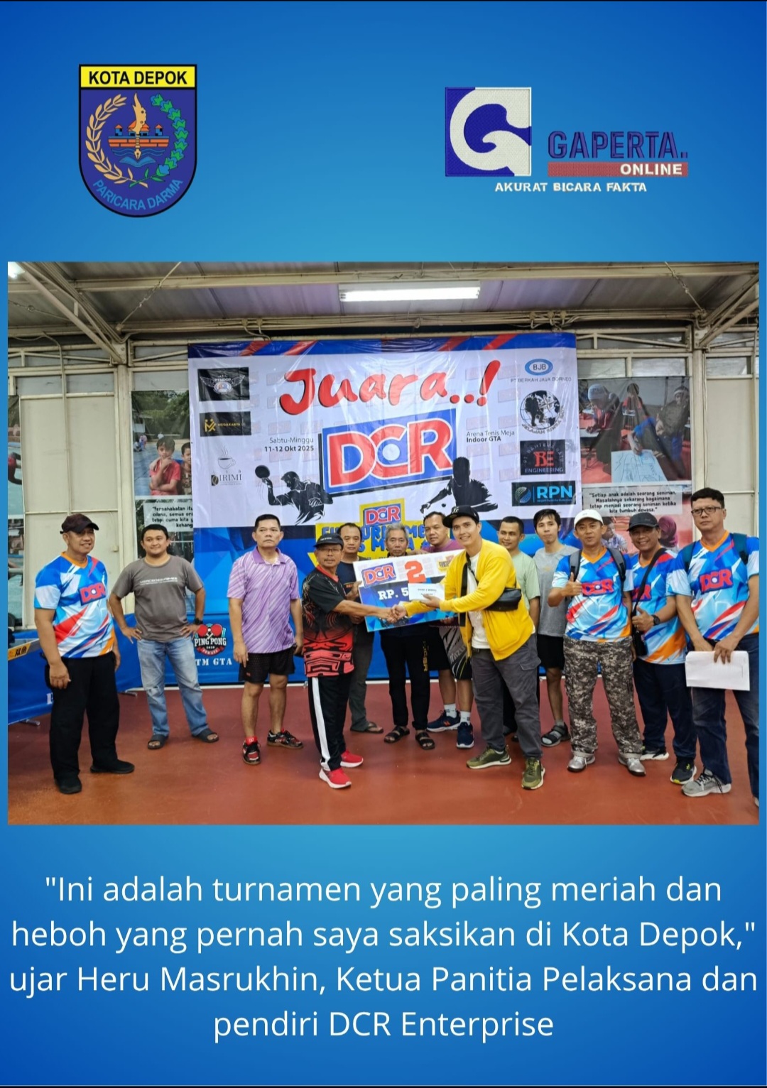 Edi Sutomo, pengurus PTMSI Kota Depok dan kepala perwasitan turnamen, menyambut baik inisiatif DCR Enterprise.