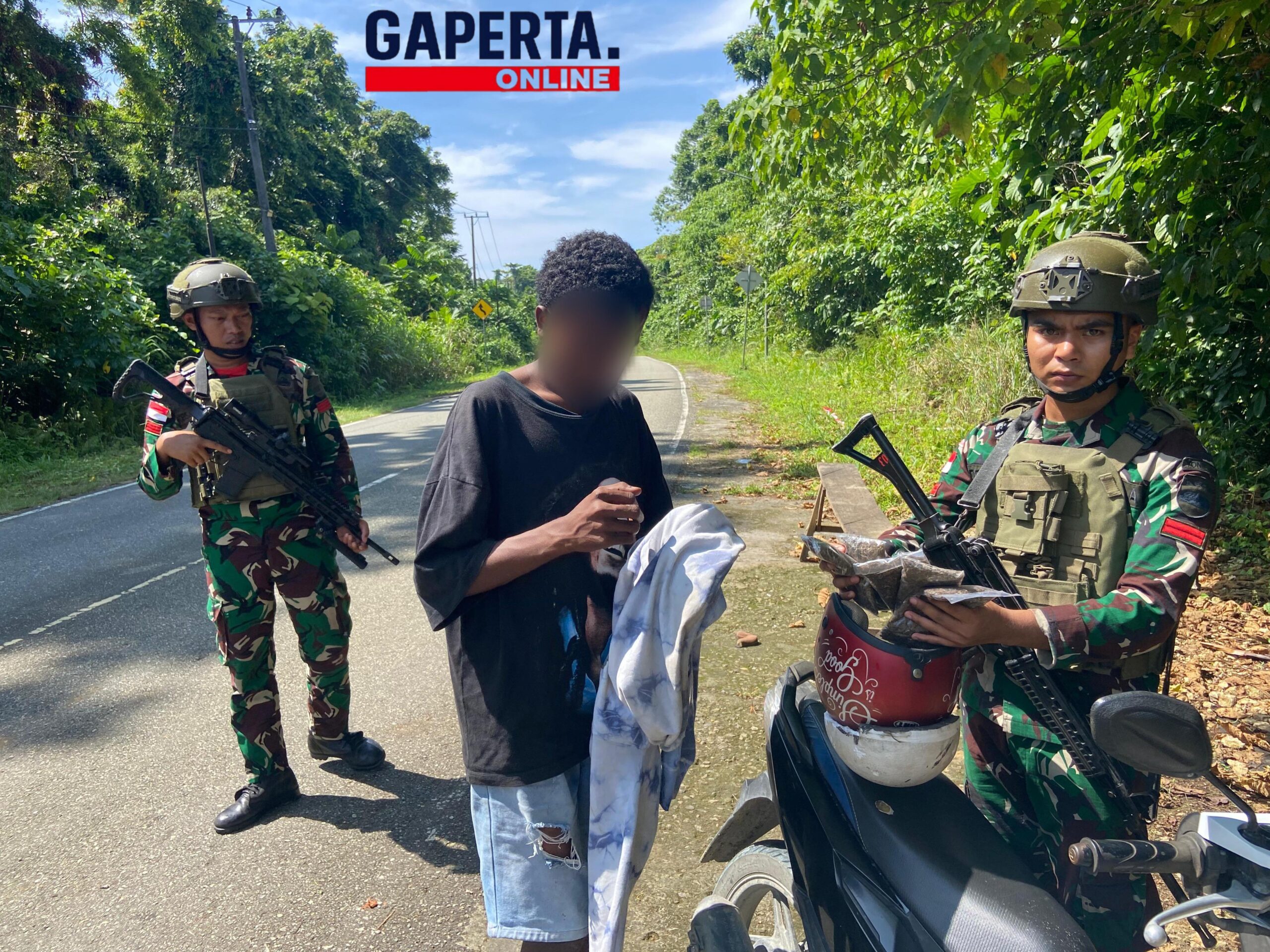 Dalam aksi patroli di jalur menuju PLBN Skouw, personel Pos Muara Tami berhasil menghentikan seorang pemuda berinisial YM (18) yang membawa 5 paket ganja kering siap edar (total 200 gram).