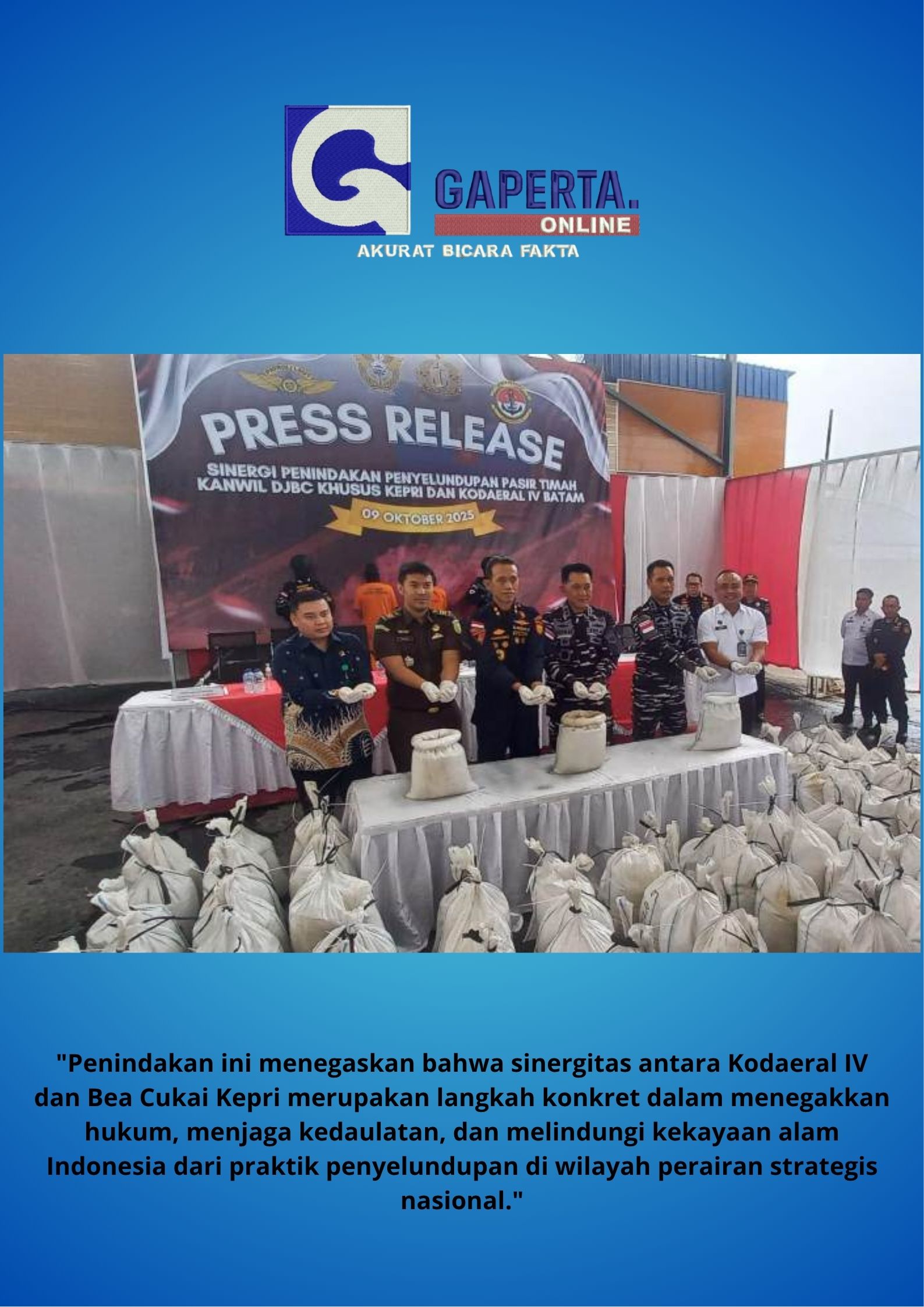 Laksda TNI Berkat Widjanarko menambahkan, “Penindakan ini menegaskan bahwa sinergitas antara Kodaeral IV dan Bea Cukai Kepri merupakan langkah konkret dalam menegakkan hukum, menjaga kedaulatan, dan melindungi kekayaan alam Indonesia dari praktik penyelundupan di wilayah perairan strategis nasional.”