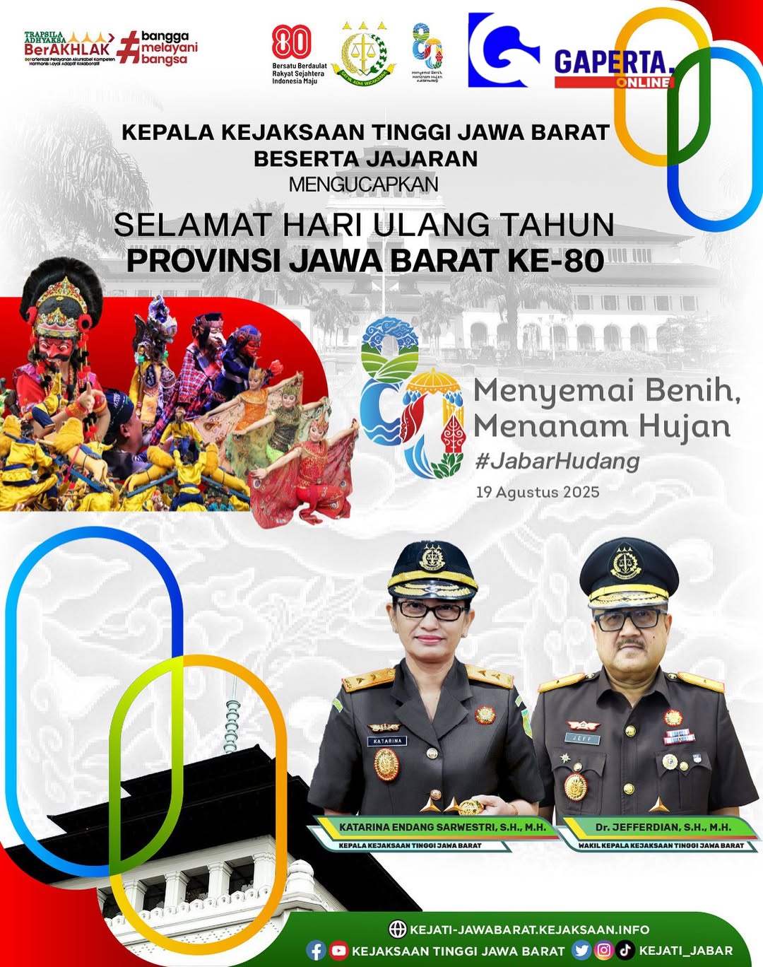 Merayakan 80 tahun pengabdian bagi bangsa, Kejaksaan Tinggi Jawa Barat memilih cara yang kekinian dan ramah lingkungan: jalan pagi dan menanam pohon! Acara yang digelar di kawasan sejuk Jayagiri Resort, Cikole (22/08) ini dipimpin langsung oleh Kajati Jabar, Katarina Endang Sarwestri.