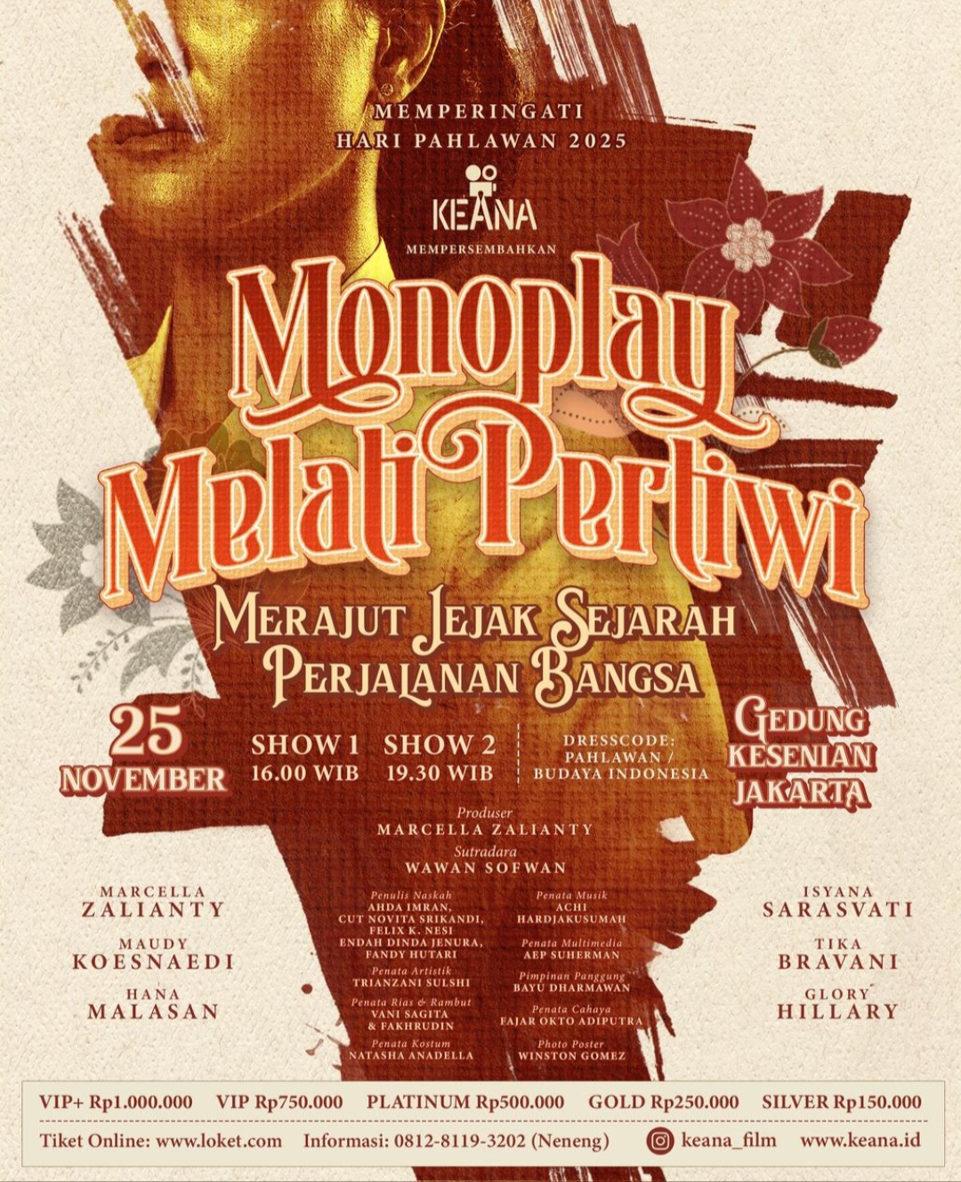 Dalam rangka memperingati Hari Pahlawan 2025, Keana Film dengan penuh kebanggaan mempersembahkan sebuah karya seni teatrikal yang mendalam, Monoplay “Melati Pertiwi: Merajut Jejak Sejarah Perjalanan Bangsa”.