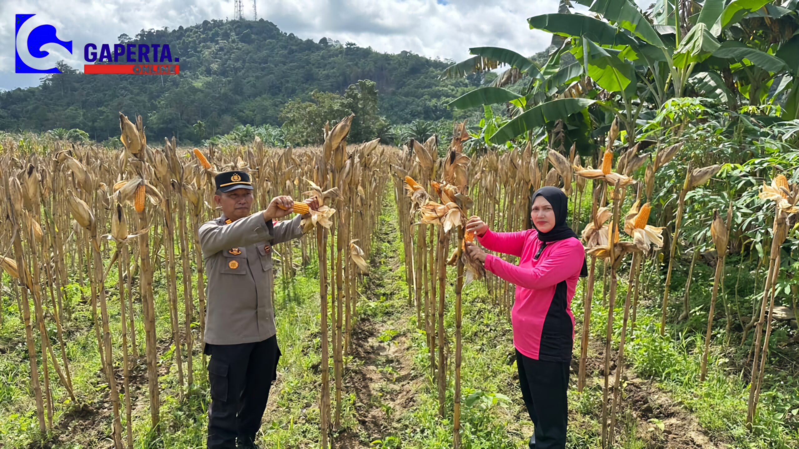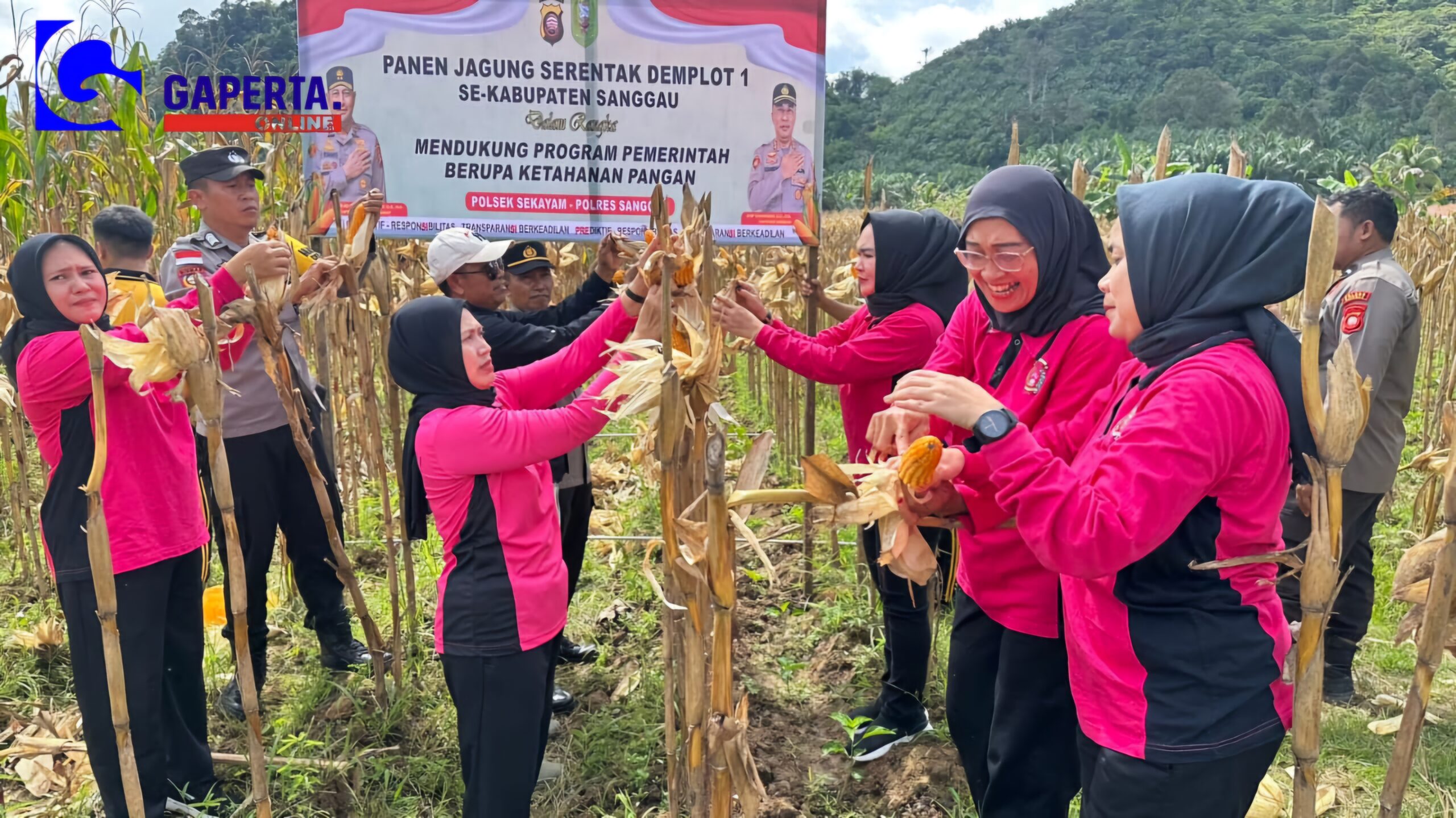 Ketua Ranting Bhayangkari Sekayam, Ny. Agustini Ramadhani, S.Pd., turut serta dalam panen jagung di lahan demplot 1 Polsek Sekayam, Kabupaten Sanggau, Sabtu (14/9), sebagai wujud dukungan terhadap program ketahanan pangan pemerintah.