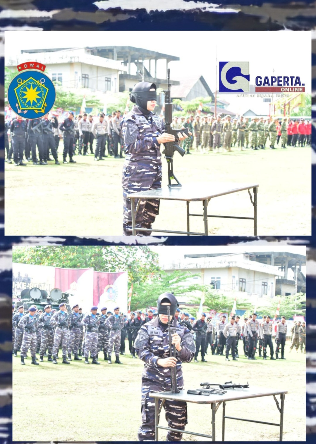 Serka Ttu Mimi Febrianti, anggota Korps Wanita Angkatan Laut (Kowal) dari Pangkalan TNI Angkatan Laut (Lanal) Ketapang, menjadi pusat perhatian dengan demonstrasi bongkar pasang senjata SS1 dengan mata tertutup. Aksi ini memukau para tamu undangan yang hadir.