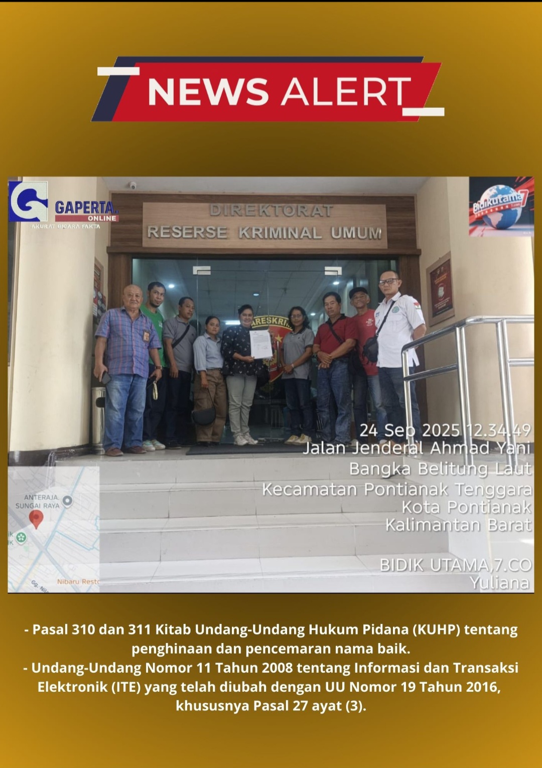 Yuliana secara resmi melaporkan dugaan tindak pidana pencemaran nama baik ke Direktorat Reserse Kriminal Khusus (Ditreskrimsus) Polda Kalimantan Barat pada hari Rabu, 24 September 2025. Laporan ini telah diterima dan terdaftar secara resmi oleh petugas piket siaga Ditreskrimsus.