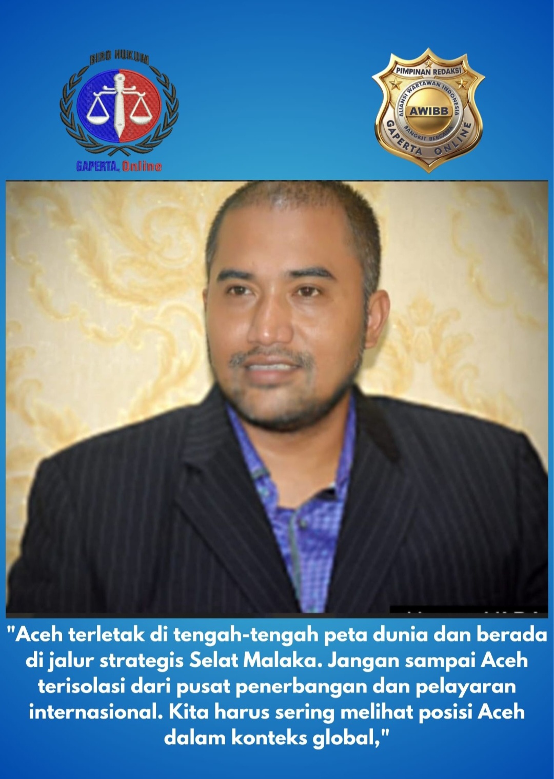 “Aceh terletak di tengah-tengah peta dunia dan berada di jalur strategis Selat Malaka. Jangan sampai Aceh terisolasi dari pusat penerbangan dan pelayaran internasional. Kita harus sering melihat posisi Aceh dalam konteks global,” ujarnya.