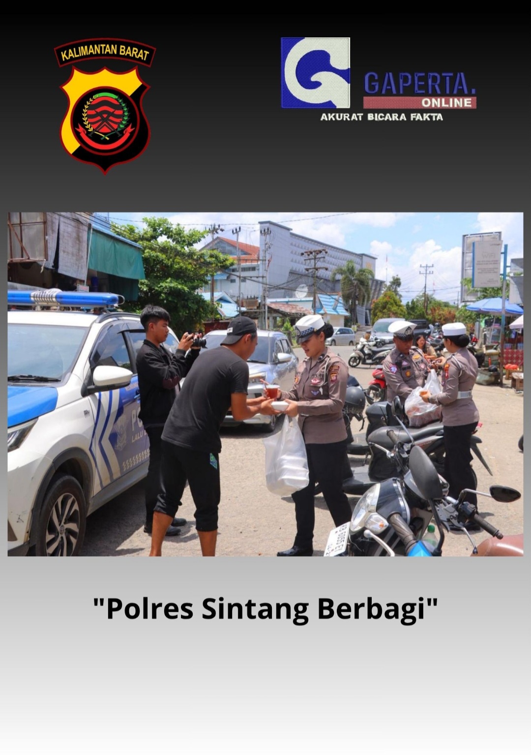 Dalam semangat berbagi dan mendekatkan diri dengan masyarakat, Polres Sintang melalui Satuan Lalu Lintas (Satlantas) melaksanakan kegiatan sosial bertajuk “Polres Sintang Berbagi” dengan membagikan makanan siap saji kepada para pengendara di sekitar Pasar Inpres Sintang pada hari Jumat (3 Oktober 2025).