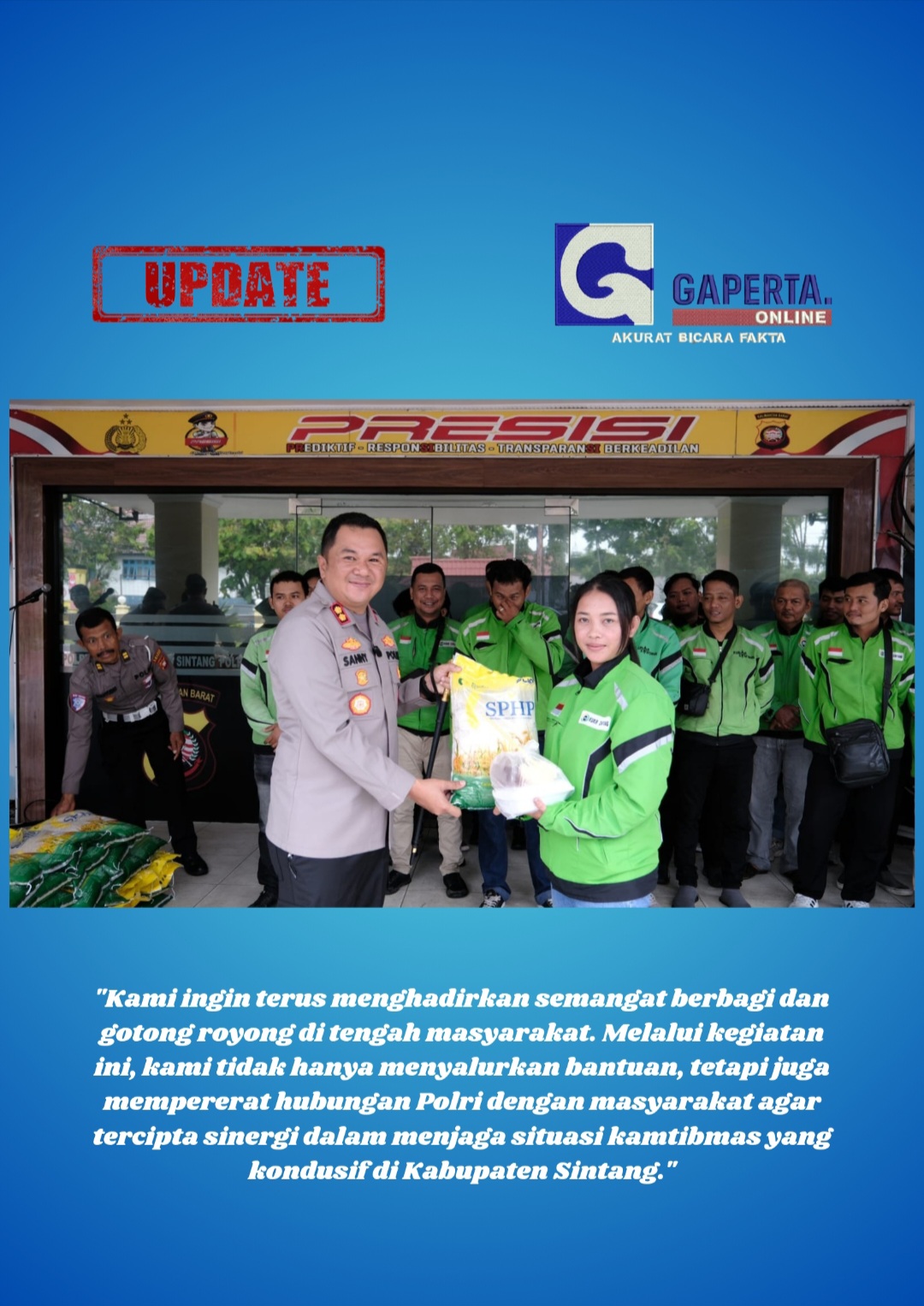 Dalam kegiatan kali ini, Polres Sintang bekerja sama dengan mahasiswa dan pengemudi ojek online untuk menyalurkan makanan siap saji dan beras kepada masyarakat yang membutuhkan.