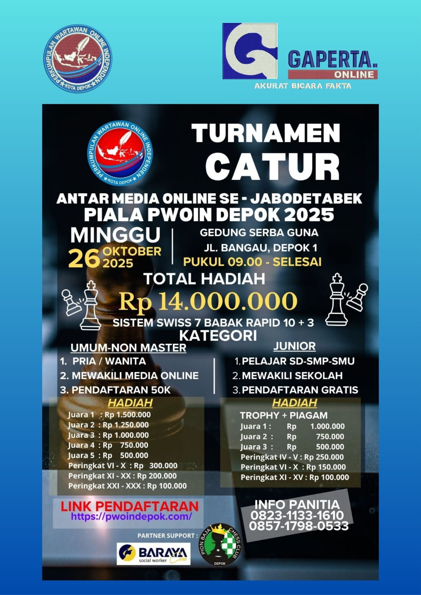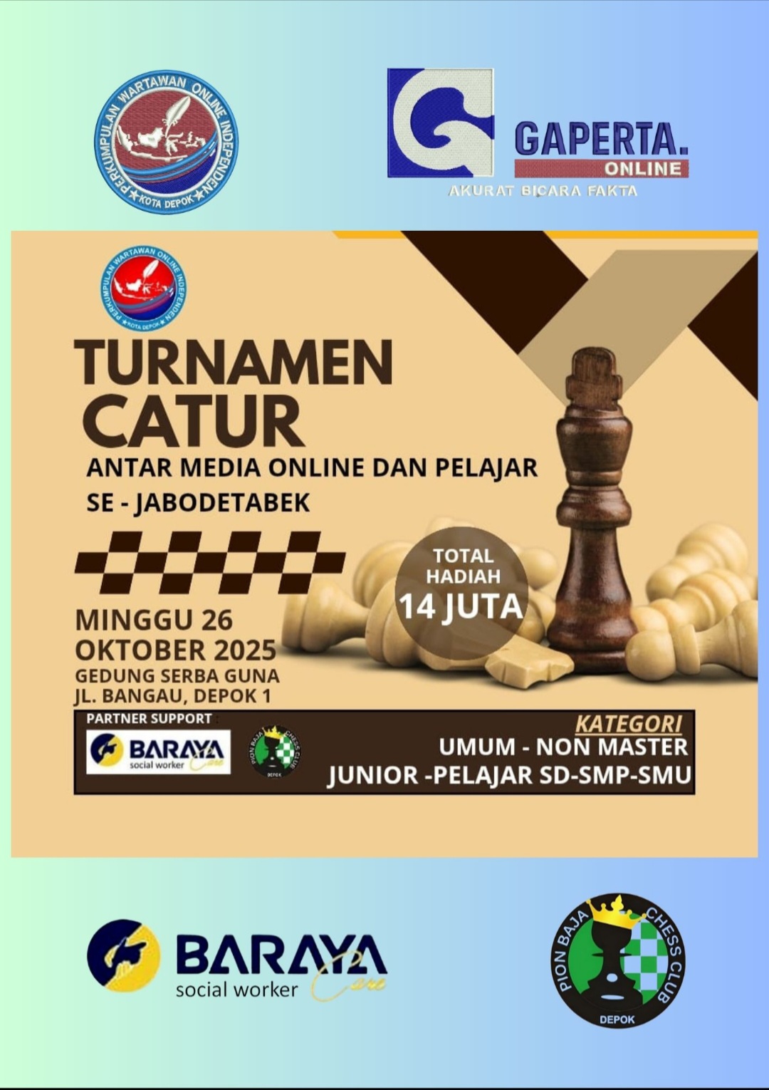 Perkumpulan Wartawan Online Independen (PWOIN) Kota Depok dengan bangga mengumumkan akan menggelar Turnamen Catur Perorangan Non-Master yang terbuka untuk seluruh insan media di wilayah Jabodetabek. Ajang ini akan menjadi wadah silaturahmi sekaligus menguji kemampuan strategi para jurnalis.