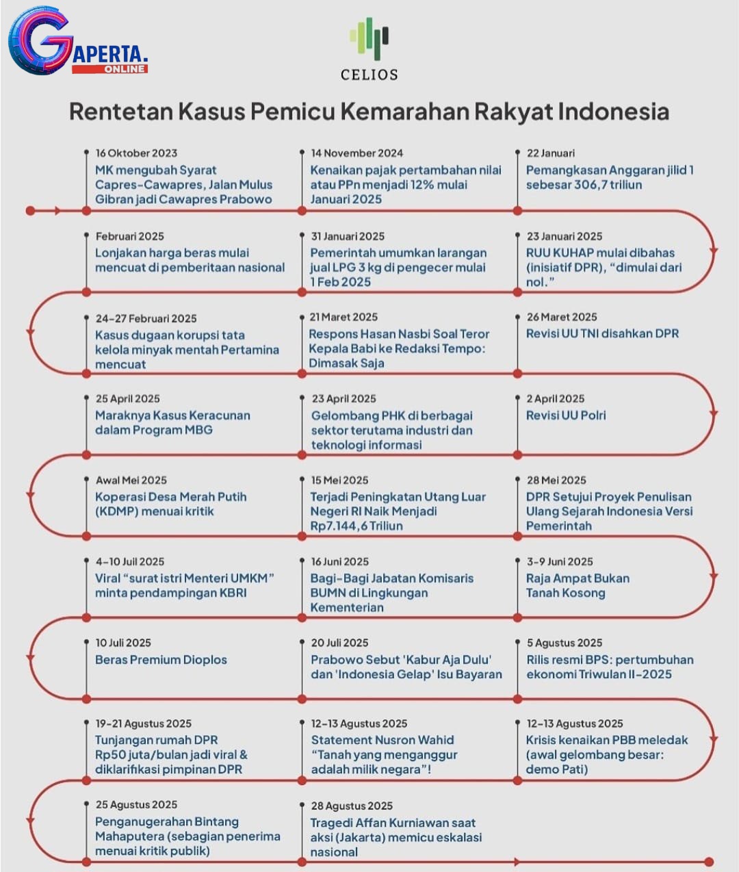 – Tragedi Affan Kurniawan (Agustus 2025): Celios memberikan perhatian khusus pada tragedi yang menimpa Affan Kurniawan saat aksi di Jakarta, yang memicu eskalasi nasional.