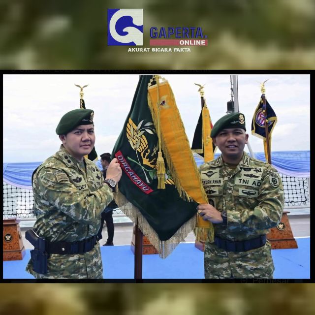 Usai acara, Teddy berfoto bersama Ade Kurniawan dengan latar belakang panji-panji Yonif 328/Dirgahayu.